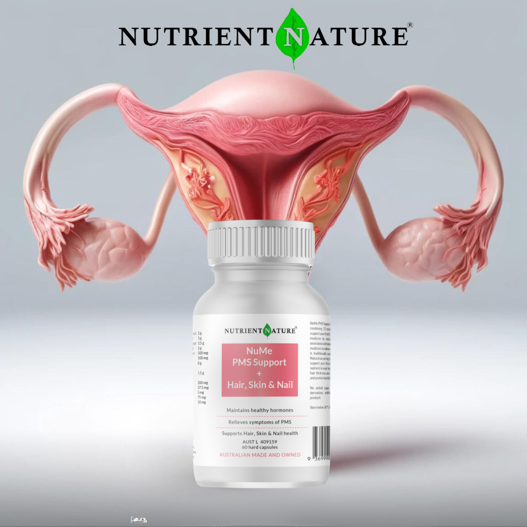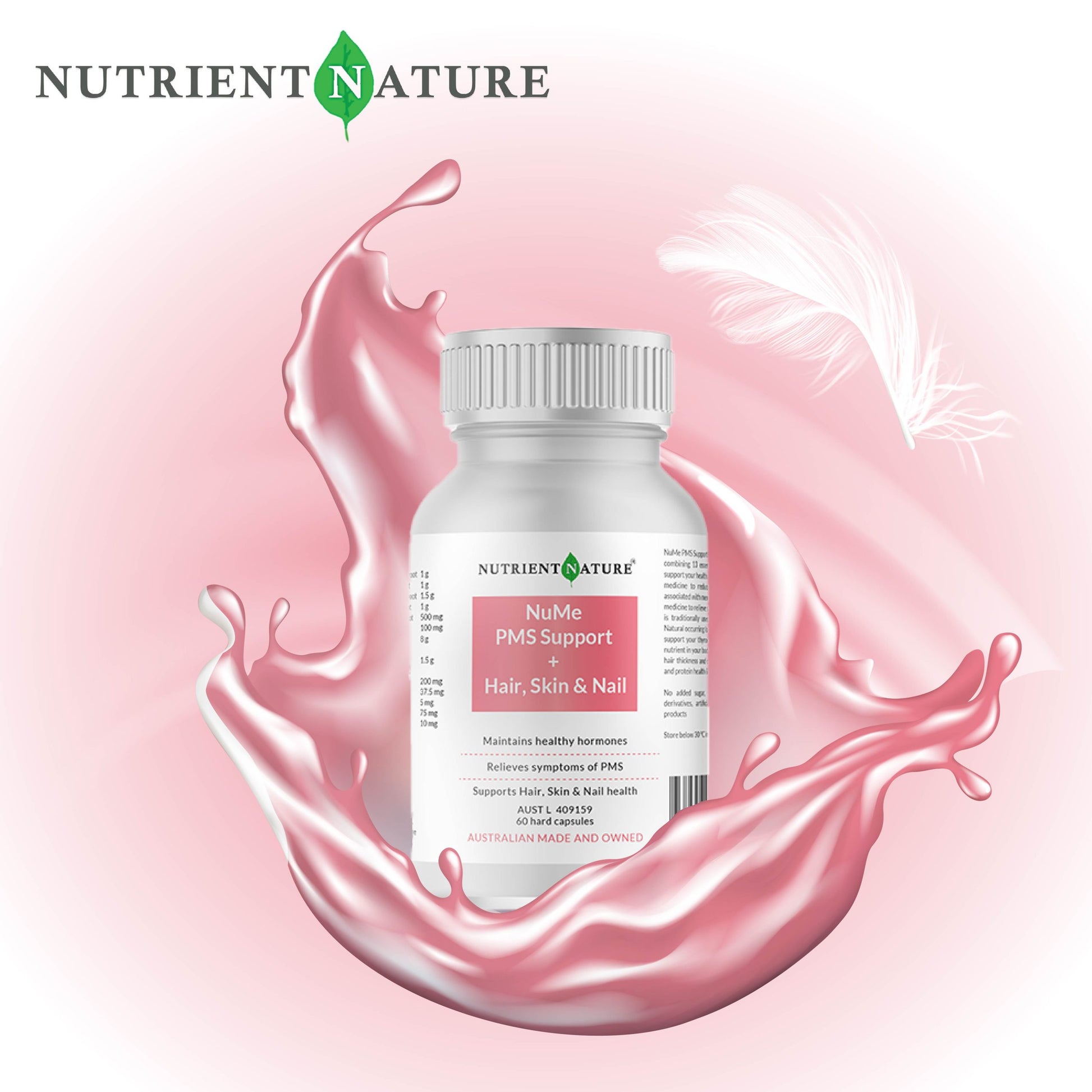 NuMe PMS Support + Hair, Skin & Nail is a premium formula combining 13 essential nutrients including herbs, vitamins, and minerals to support your health. Rehmannia and Dong quai are traditionally used in Chinese medicine to reduce menstrual cycle irregularity and relieve hot flushes associated with menopause. Chaste tree is traditionally used in Western herbal medicine to relieve symptoms of Premenstrual syndrome (PMS). Ashwagandha is traditionally used in Ayurvedic medicine to relieve symptoms of stress. Natural occurring Iodine derived from Knotted wrack and Bladder wrack helps support your thyroid hormone health and reduce hair loss. Biotin is the key nutrient in your body to grow and develop healthy hair. Silica and Zinc support hair thickness and strength, while vitamin C supports immune system health and protein health & formation.